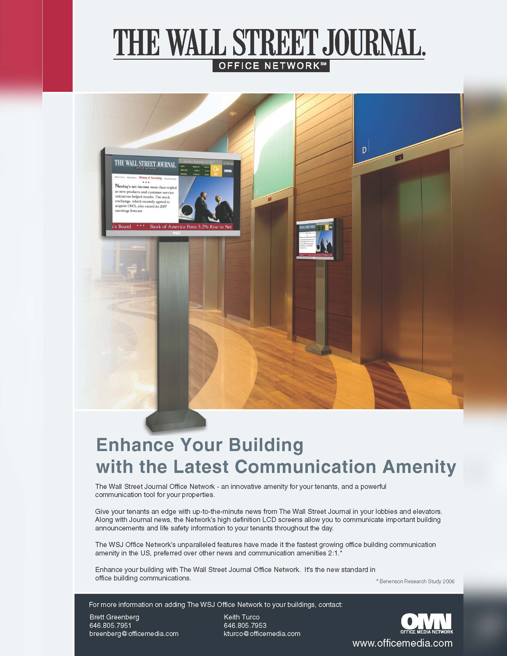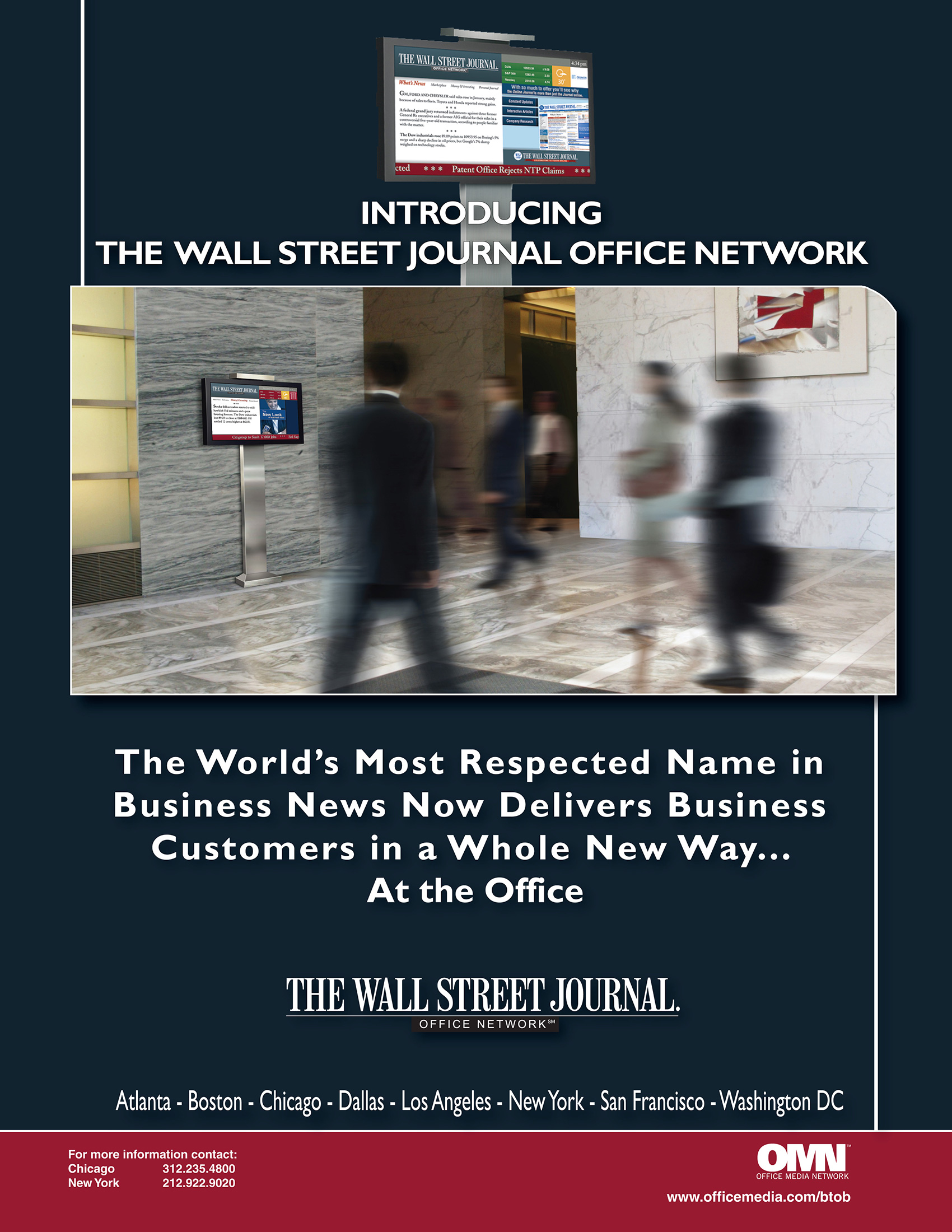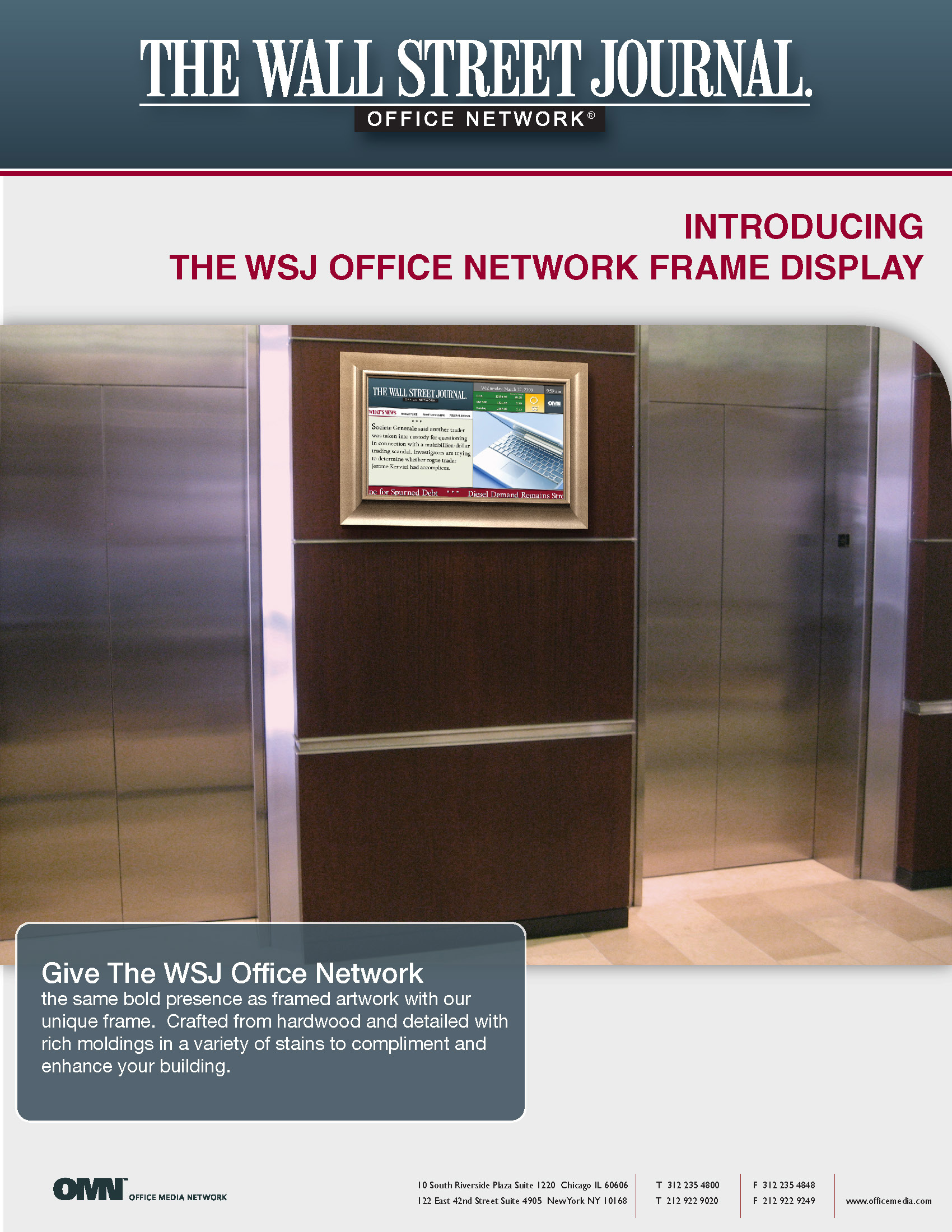 The Wall Street Journal Office Network is a leading digital place-based media and marketing network. The network consists of large, high-definition screens located in the lobbies and elevators of 760+ premier office buildings in 15 major U.S. cities, and is viewed by approximately 1 million affluent, business decision-makers each business day. As an advertising vehicle, The Wall Street Journal Office Network is unique in its ability to deliver highly impactful messages at work, closest to the moments when customers are considering and making important buying decisions....