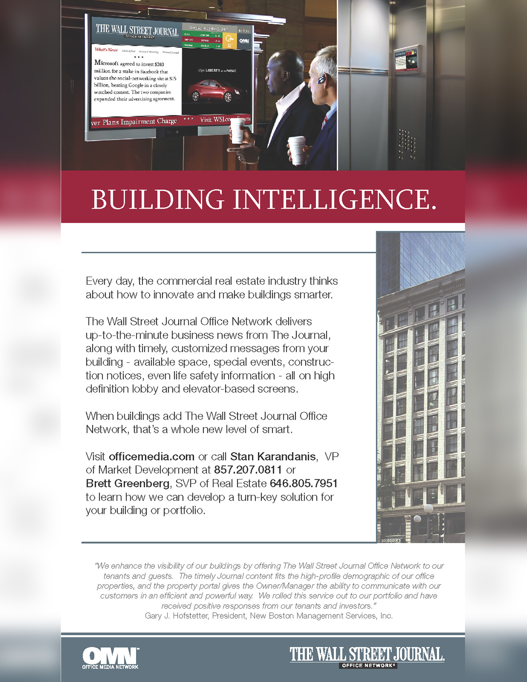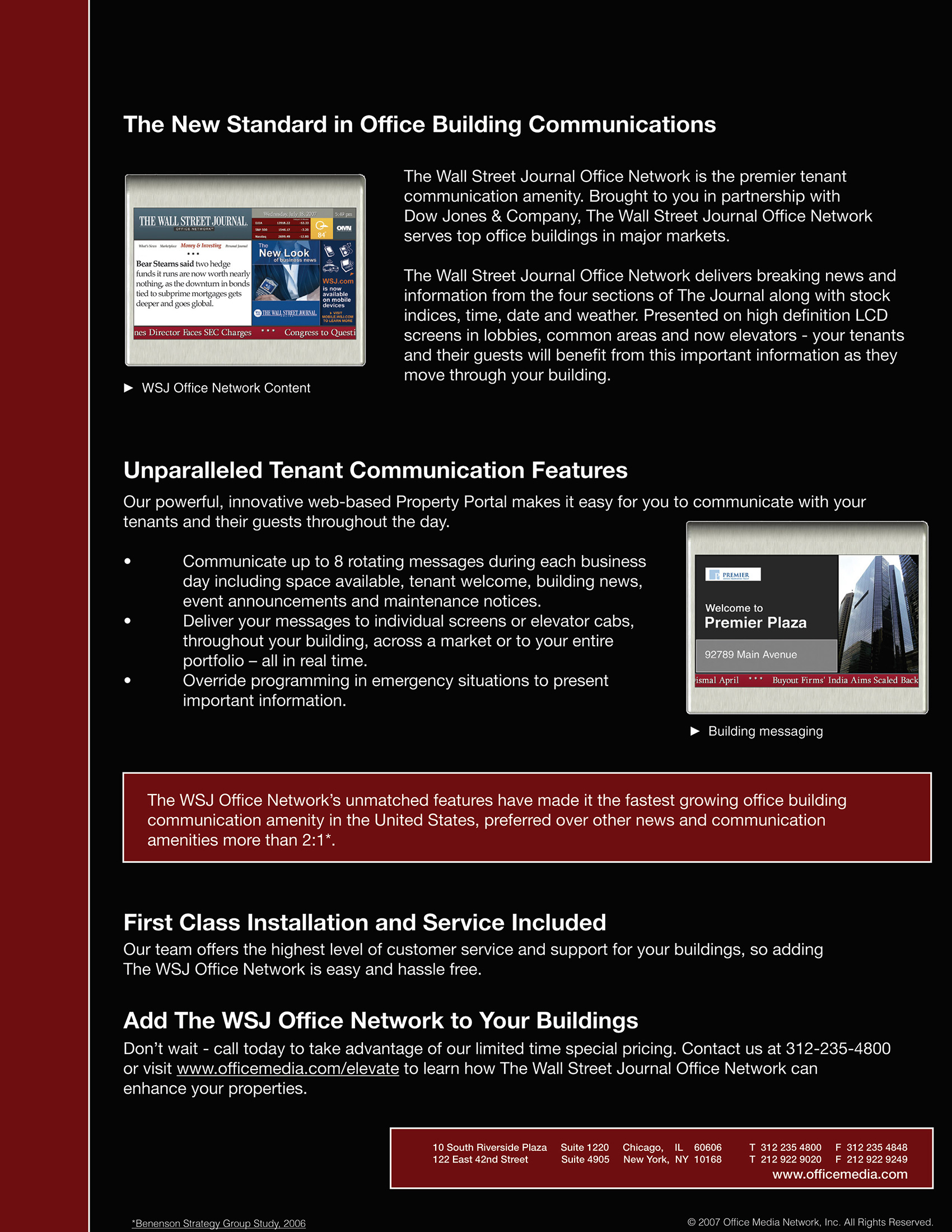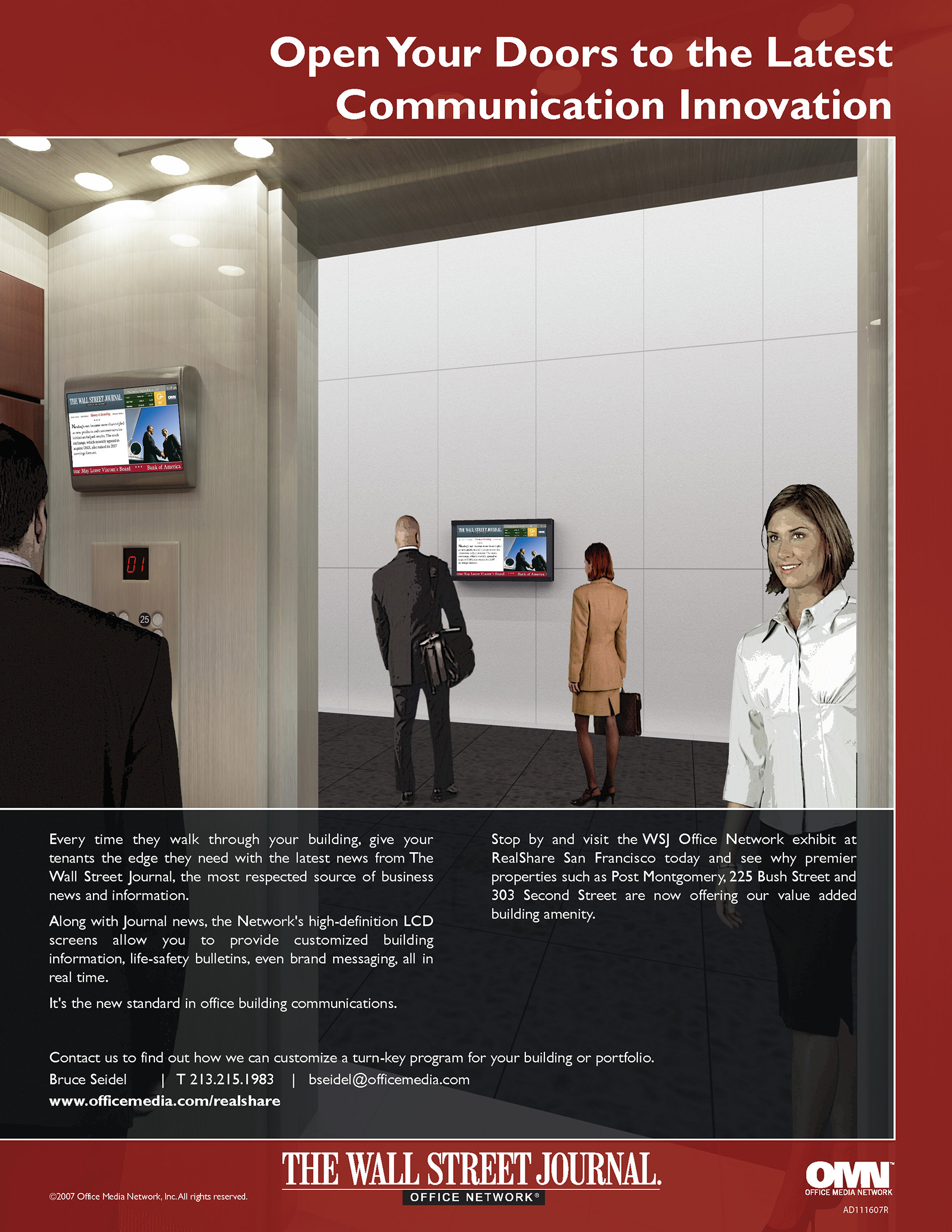 The Wall Street Journal Office Network is a leading digital place-based media and marketing network. The network consists of large, high-definition screens located in the lobbies and elevators of 760+ premier office buildings in 15 major U.S. cities, and is viewed by approximately 1 million affluent, business decision-makers each business day. As an advertising vehicle, The Wall Street Journal Office Network is unique in its ability to deliver highly impactful messages at work, closest to the moments when customers are considering and making important buying decisions....